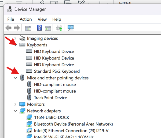 If you see the keyboard or mouse having yellow warning icon, it could be a driver or hardware issue.